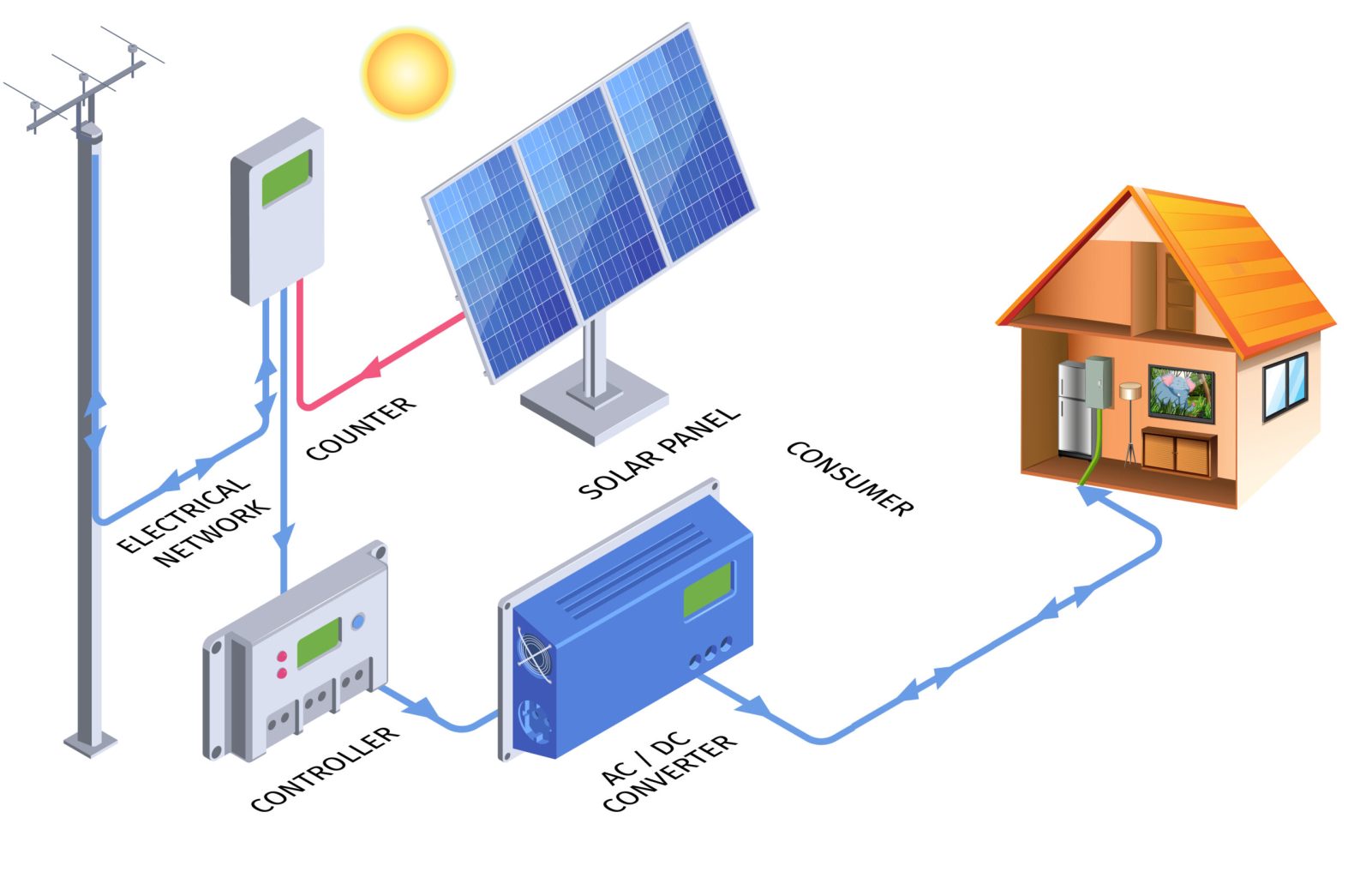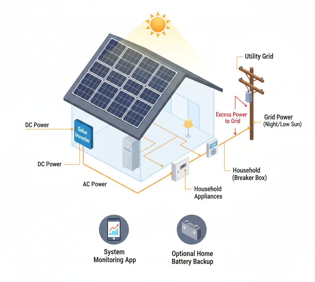 A grid-tied solar system converts sunlight into electricity and feeds it directly into the utility grid. You consume solar energy first and send surplus units back to the grid through net metering, reducing your monthly electricity bill.